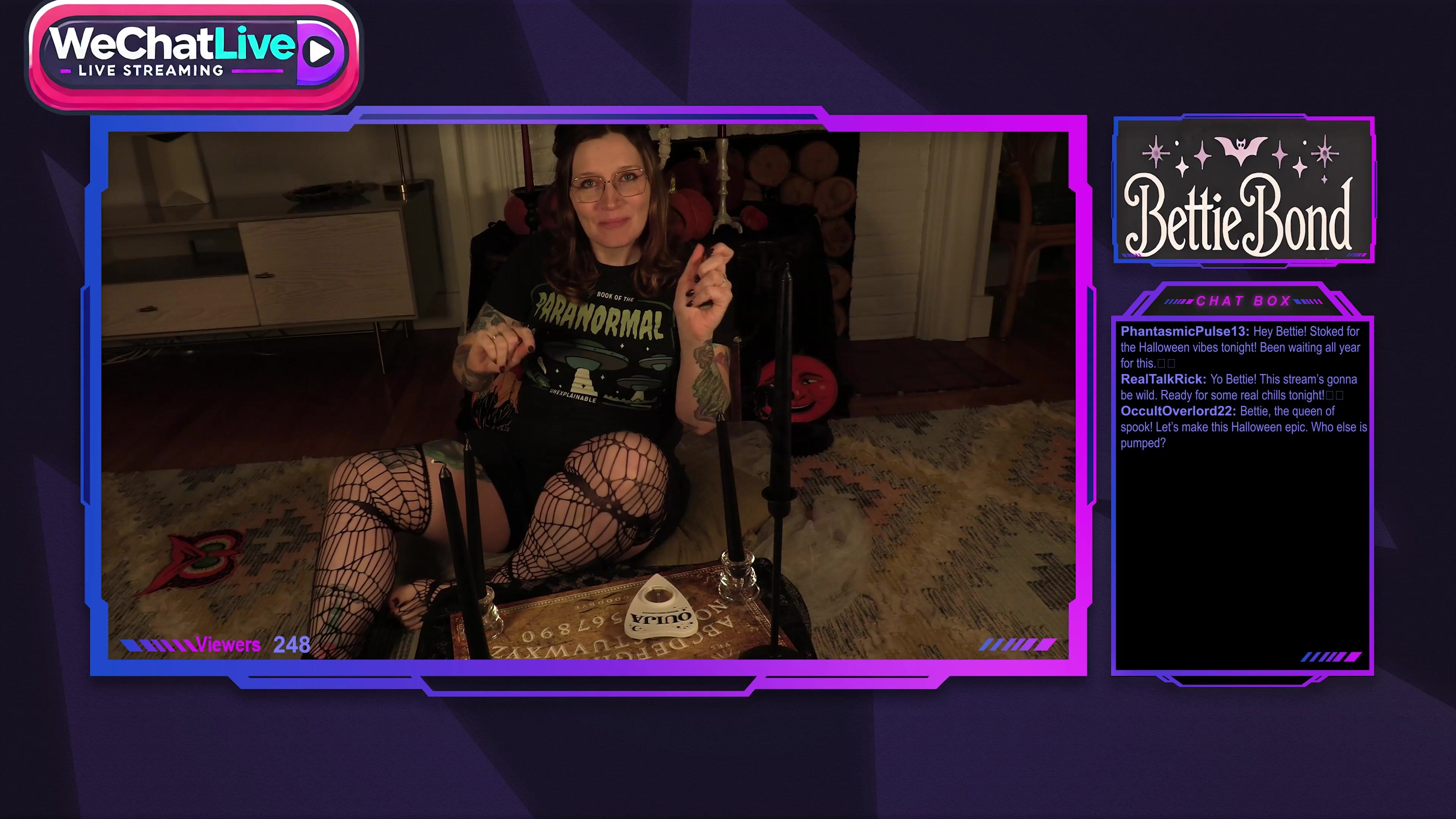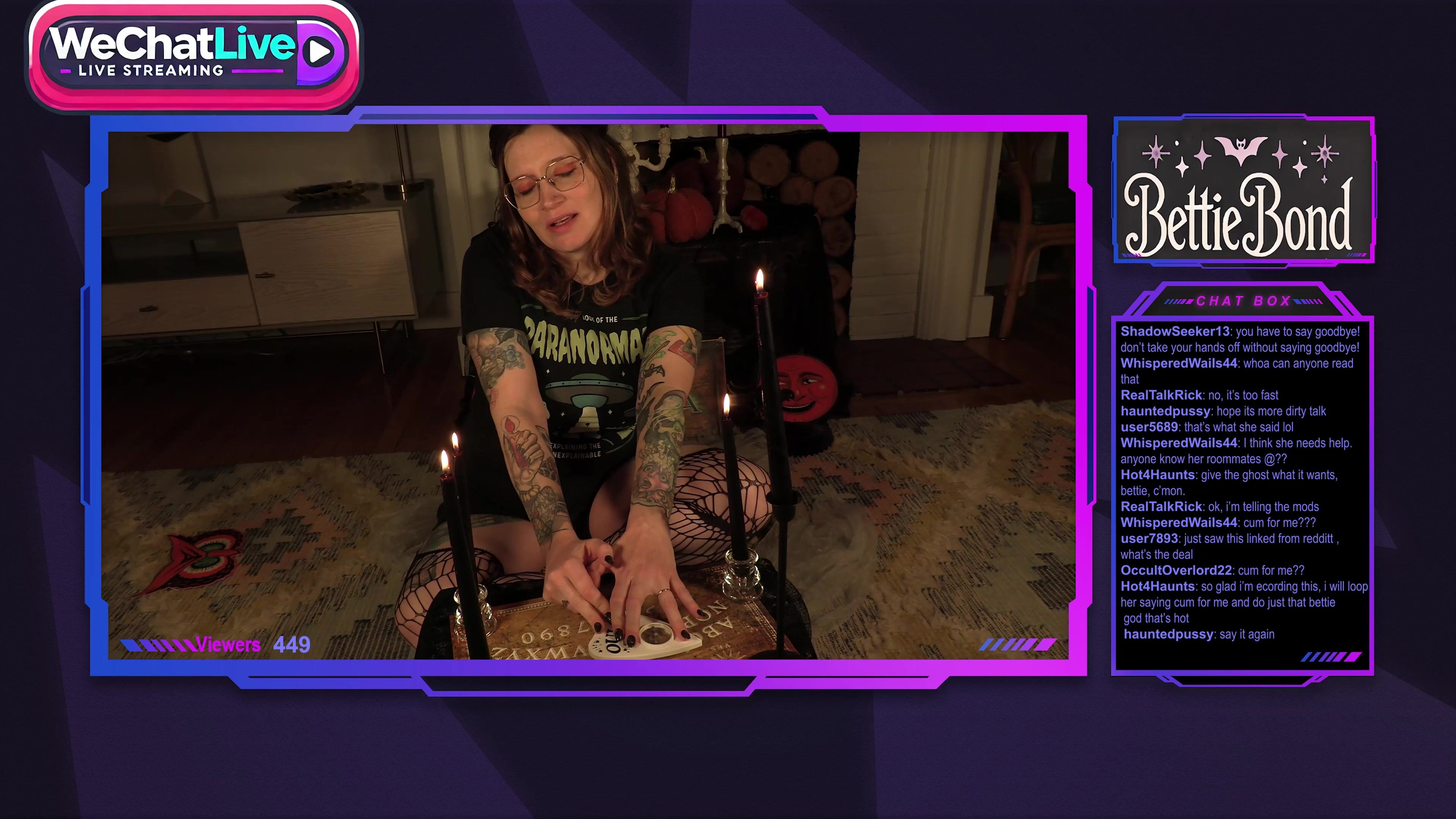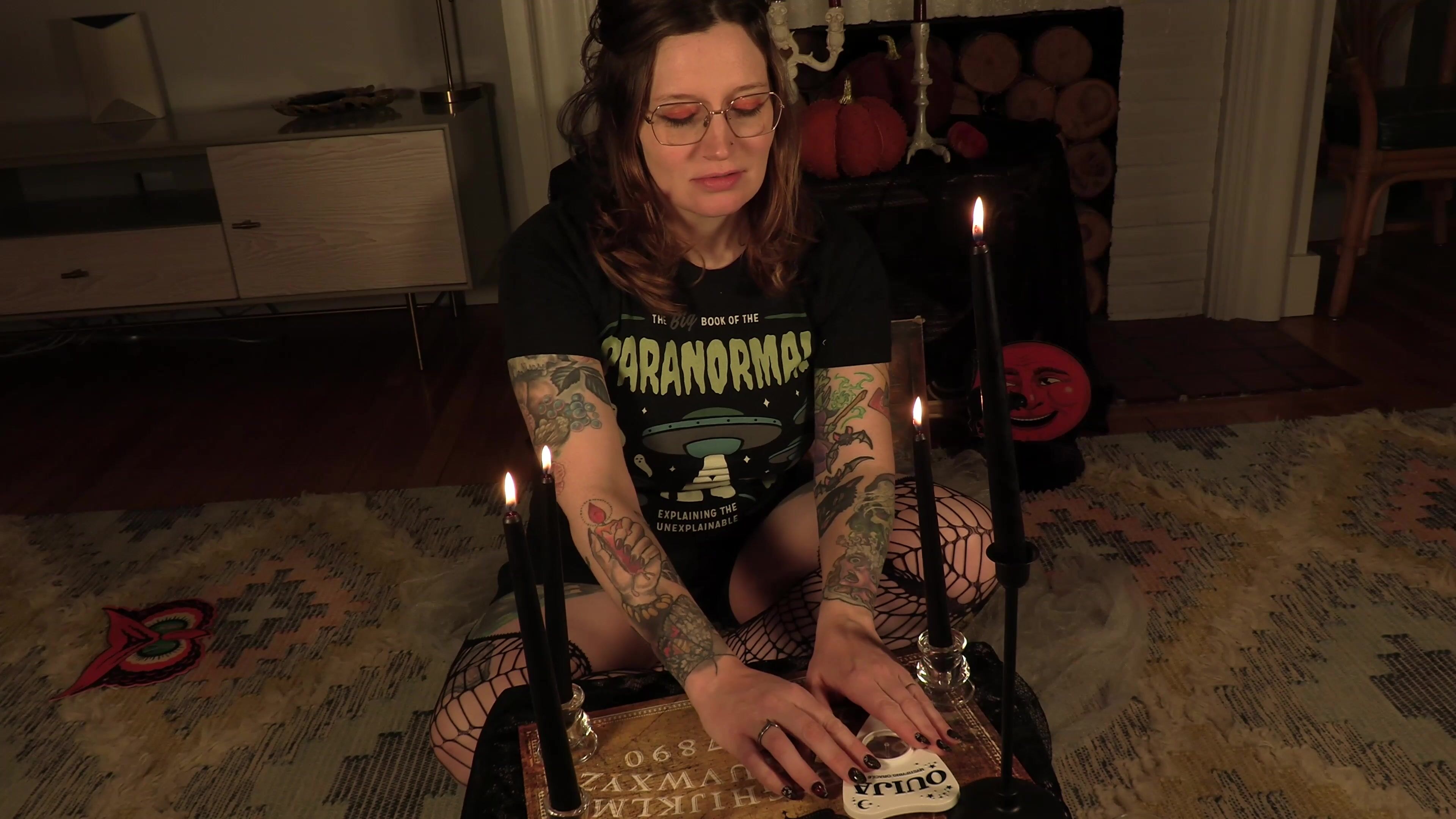 Inked BettieBond gets naked and rides her dildo while performing a spooky seance live on video.