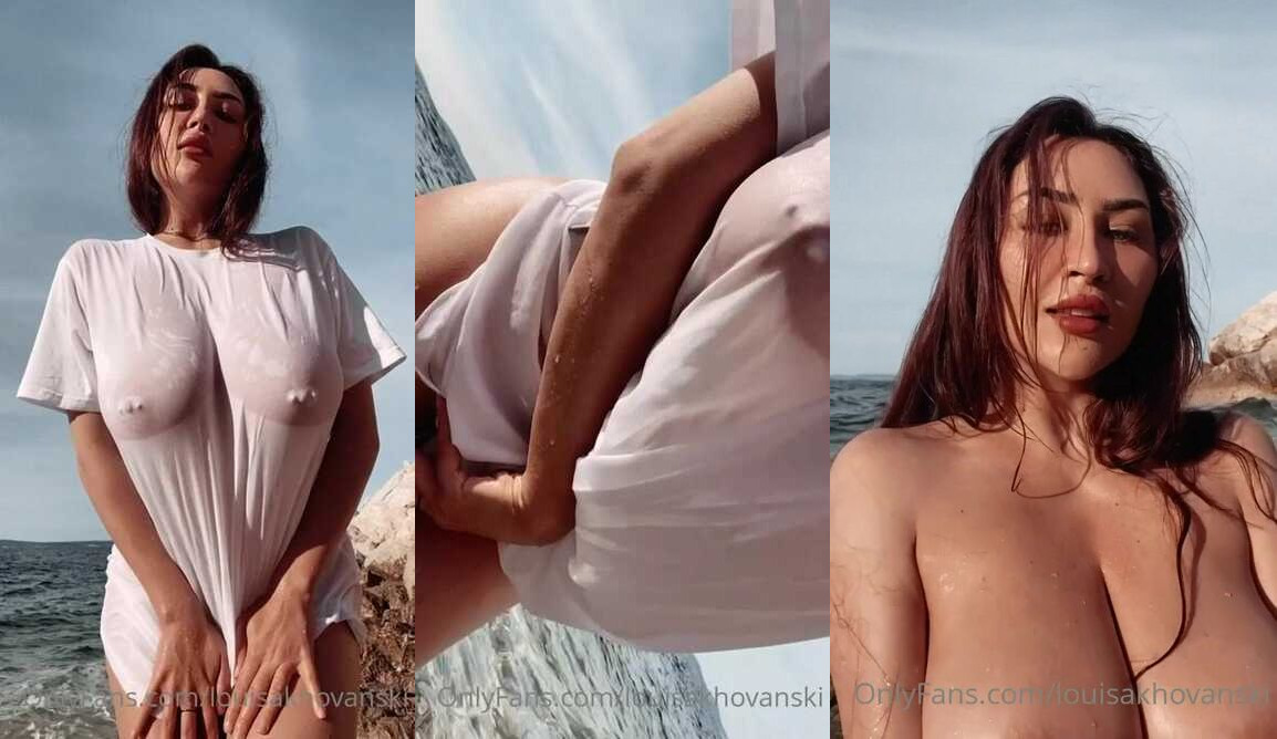 Louisa Khovanski gets playful by the beach in a wet white top slowly revealing her perfect tits and pussy in this steamy video.