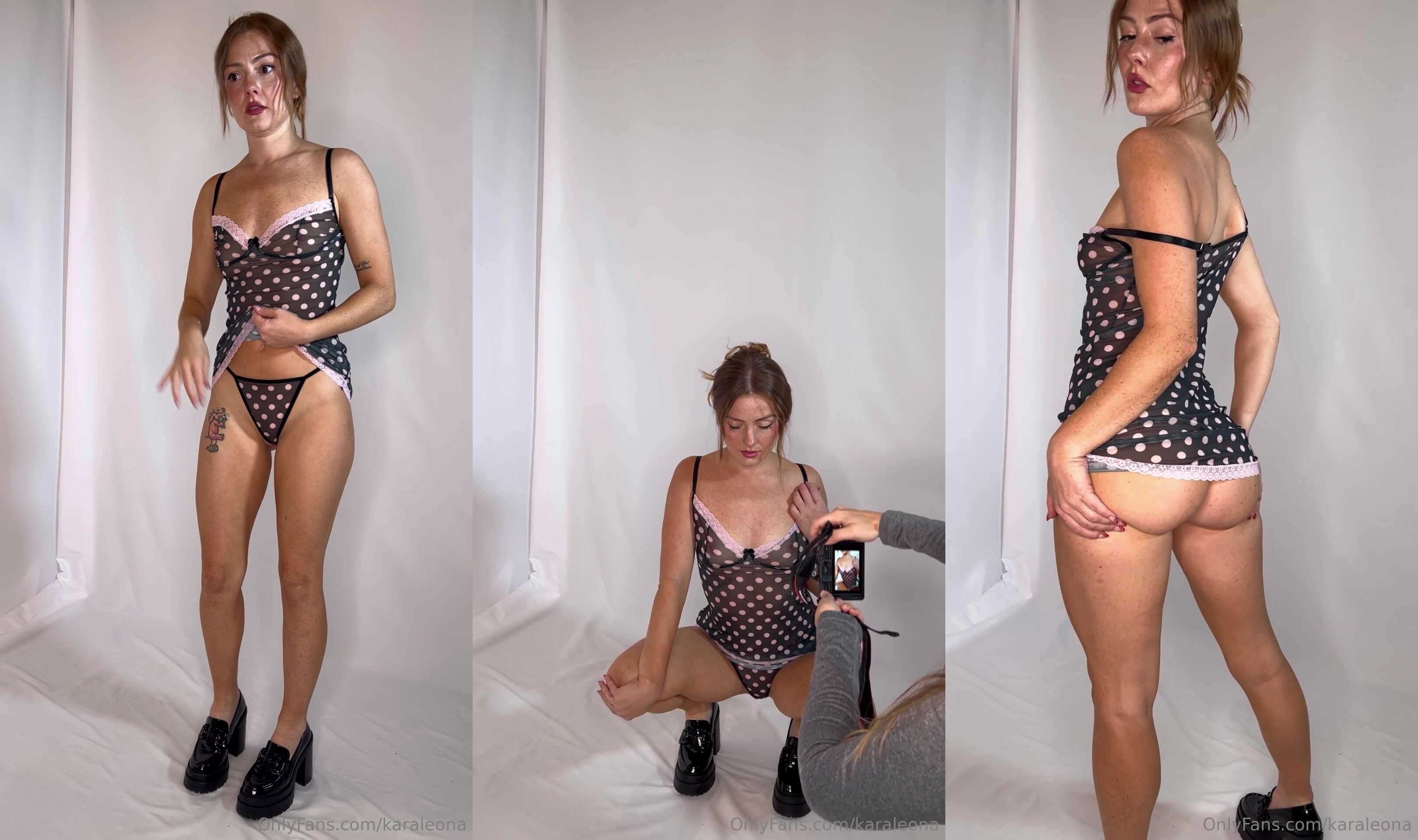 Karaleona from OnlyFans teases in this steamy video, showing off her curves in polka dot lingerie and black shoes.