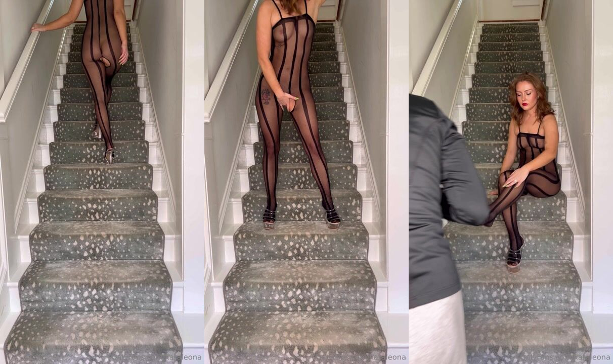 Kaleona teases in sexy black lingerie and stockings on a staircase before things heat up in this steamy video.