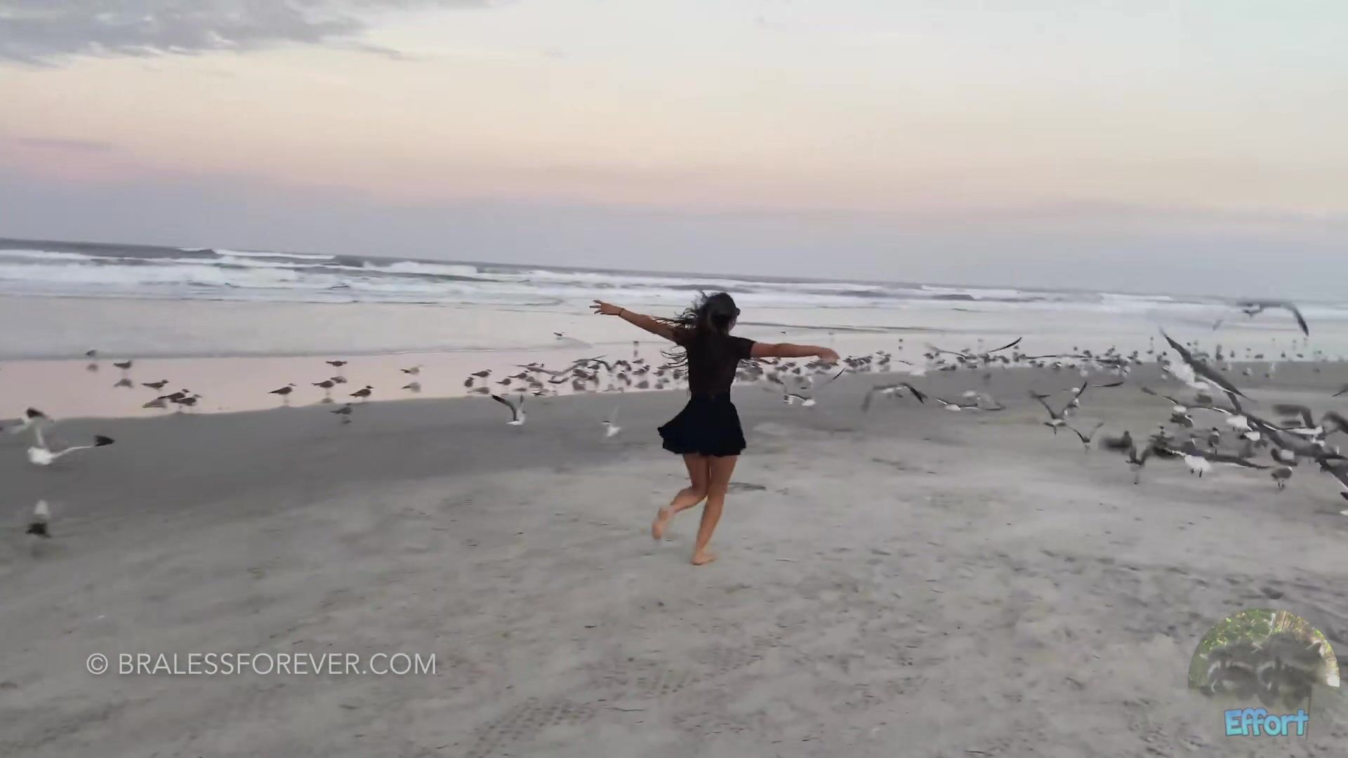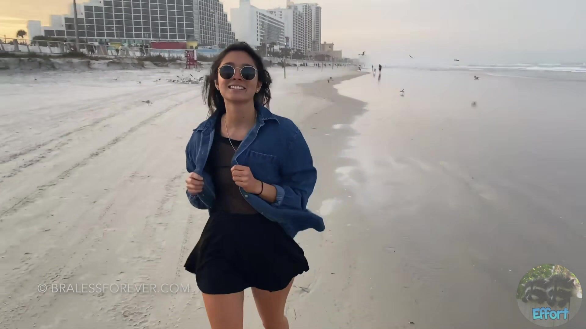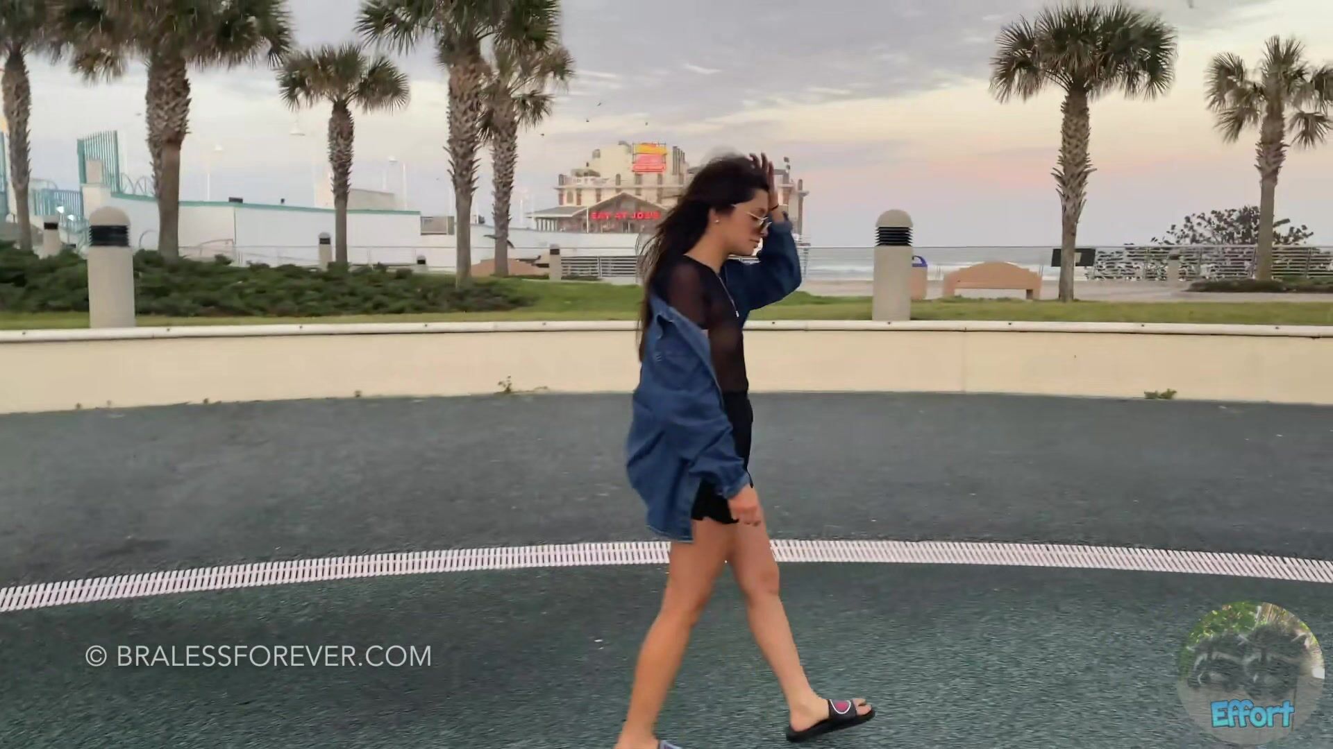 Braless Forever cute brunette shows in a sheer shirt during a sexy beach outing in this irresistible video.