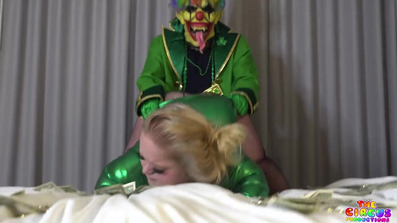 Petite Cutie gets fucked hard by GIbbyTheClown in St Pattys day costume on a bed full of cash in this wild video.