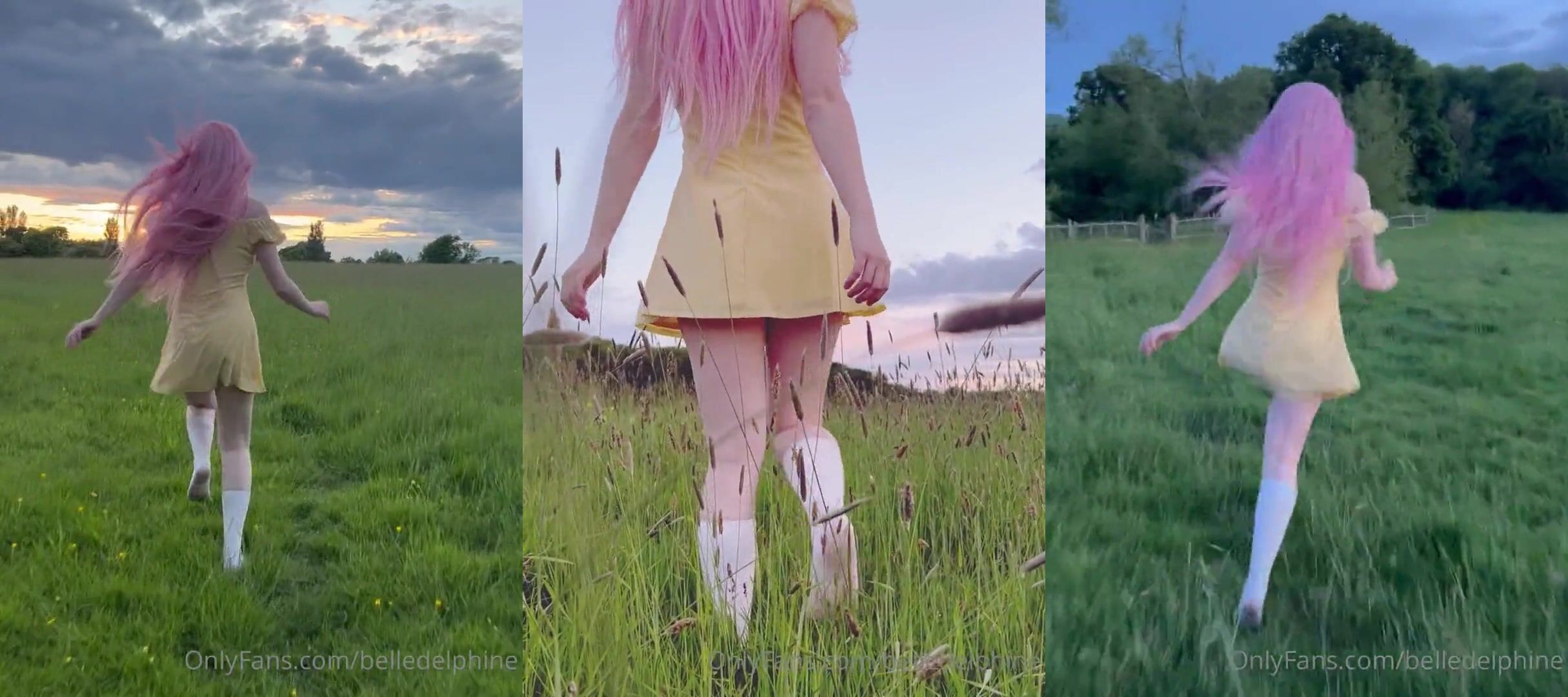 BelleDelphine Teases in Yellow Dress and White Stockings in Outdoor Field Video from OnlyFans